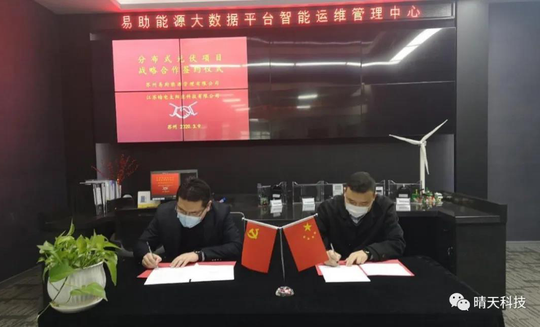2020年3月9日上午,江蘇晴電太陽能科技有限公司與蘇州易助能源管理有限公司正式簽署了《分布式光伏項目戰略合作協議》。