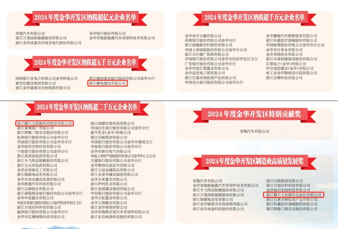 2025年2月12日,金華經濟技術開發區召開2025年工作會議,會議全面總結了過去一年的經濟發展成果,并對為開發區經濟社會發展作出突出貢獻的企業進行了表彰。晴天科技榮獲“2024年度開發區高質量發展獎”,“2024年度開發區納稅超五千萬元企業”、“2024年度開發區納稅超二千萬企業”稱號。值得一提的是,這已是晴天科技多次榮獲“納稅超千萬企業”稱號,充分彰顯了企業的綜合實力與社會責任感。