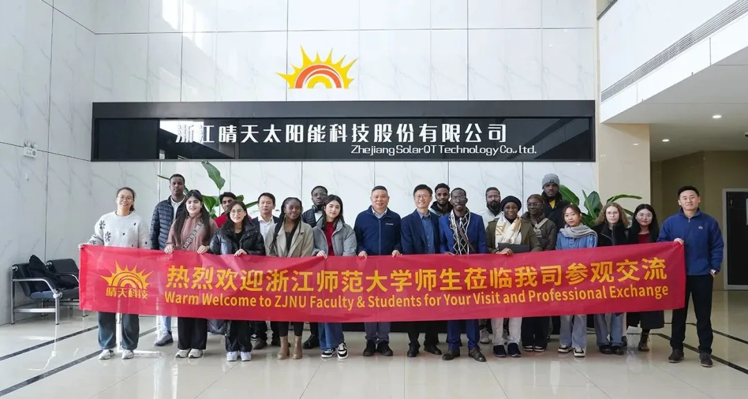 2025年2月28日,浙江師范大學(xué)國際處沈處長(zhǎng)帶領(lǐng)20余名來自全球十幾個(gè)國家的留學(xué)生走進(jìn)晴天科技總部,開展了一場(chǎng)以“中國光伏與世界”為主題的參觀交流活動(dòng)。作為光伏行業(yè)的標(biāo)桿企業(yè),晴天科技向師生們展示了清潔能源技術(shù)的創(chuàng)新成果與企業(yè)文化內(nèi)核。